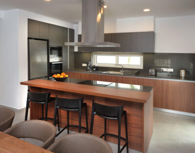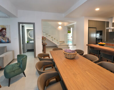 The villa consists of two levels, where the elegant and luxury décor of the villa is adorned with beautiful colours and modern furnishings. In the open plan living and dining area, you can spend a relaxing time with family and friends. On this level there is a fully equipped kitchen, a singles air- conditioned bedroom as well as a separated guest WC with shower.