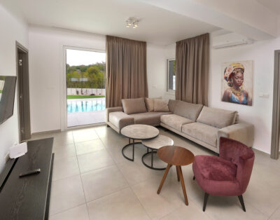 The outdoor area provides a spacious deck with sunbeds and sun lounges, surrounding the tempting crystal clear waters of the pool (dimensions is 7m x 3, depth 90 going to 150). A BBQ is available for dinning al fresco at the elegant outdoor dining area.
