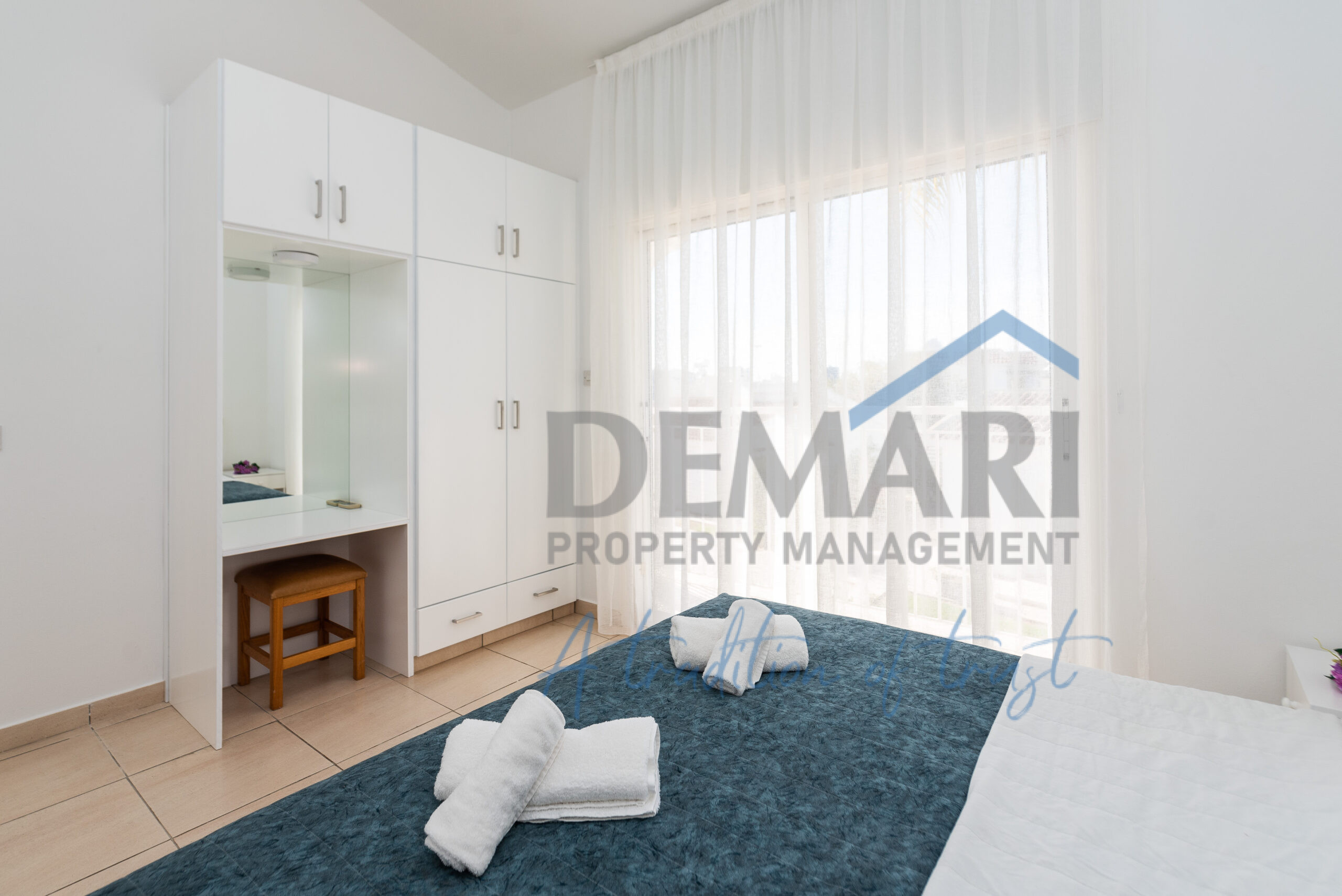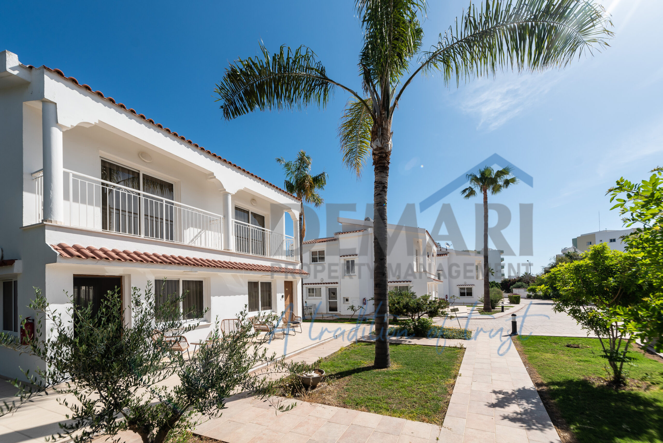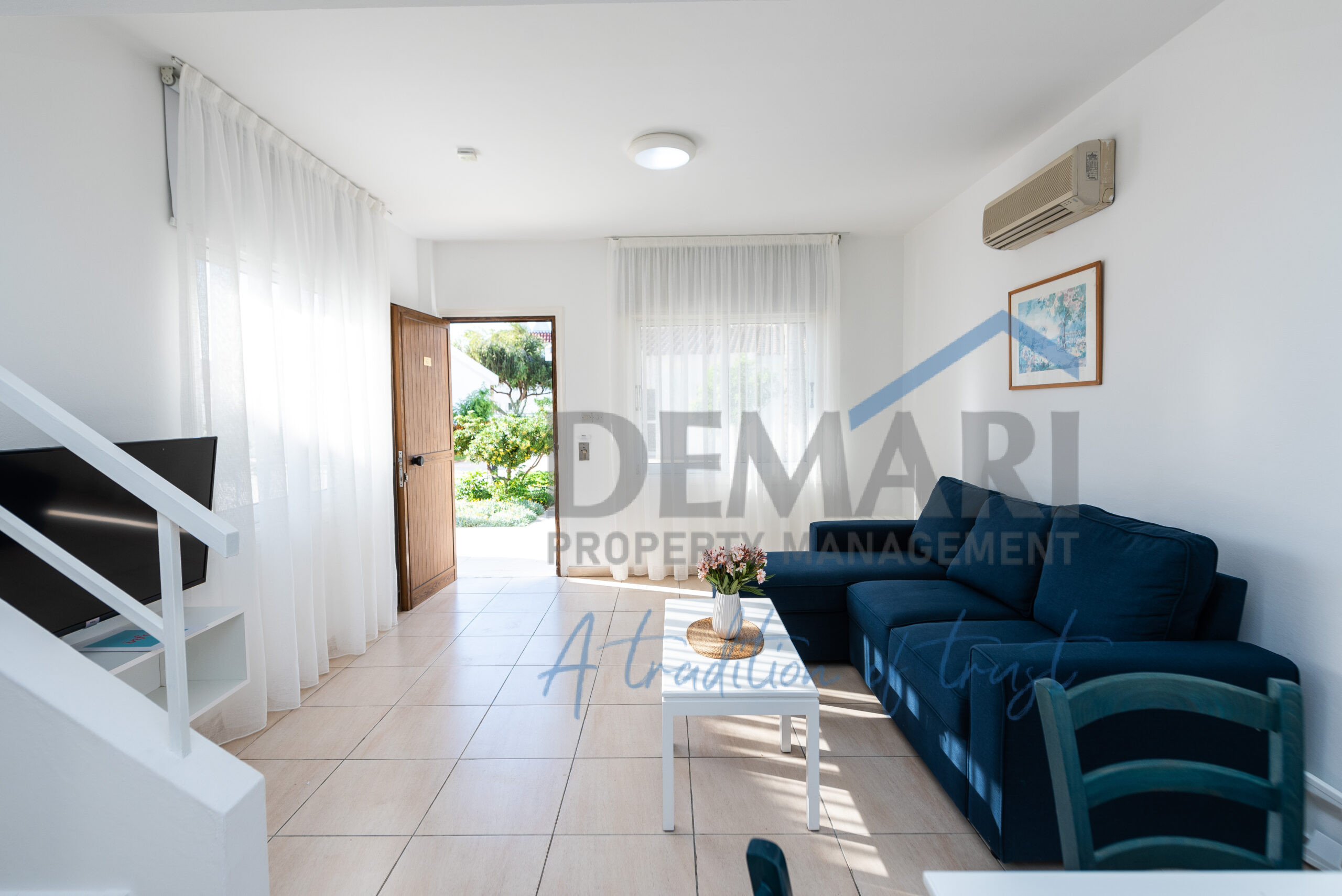 This simple but elegant two-bed townhouse features an open plan living and dining area and a fully equipped kitchen. All bedrooms share a family bathroom and a guest toilet. Bedrooms consist of built-in wardrobes and bed side tables. All rooms are fitted with air condition units offering all year round comfort. The small patio has garden furniture and offers a great view of the gardens for relaxing moments with friends and family.