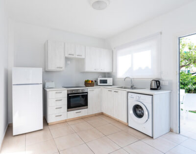 This simple but elegant two-bed tohnhouse features an open plan living and dining area and a fully equipped kitchen. All bedrooms share a family bathroom a guest toilet. Bedrooms consist of built-in wardrobes and bed side tables. All rooms are fitted with air condition units offering all year round comfort. The small patio has garden furniture and offers a great view of the gardens for relaxing moments with friends and family.