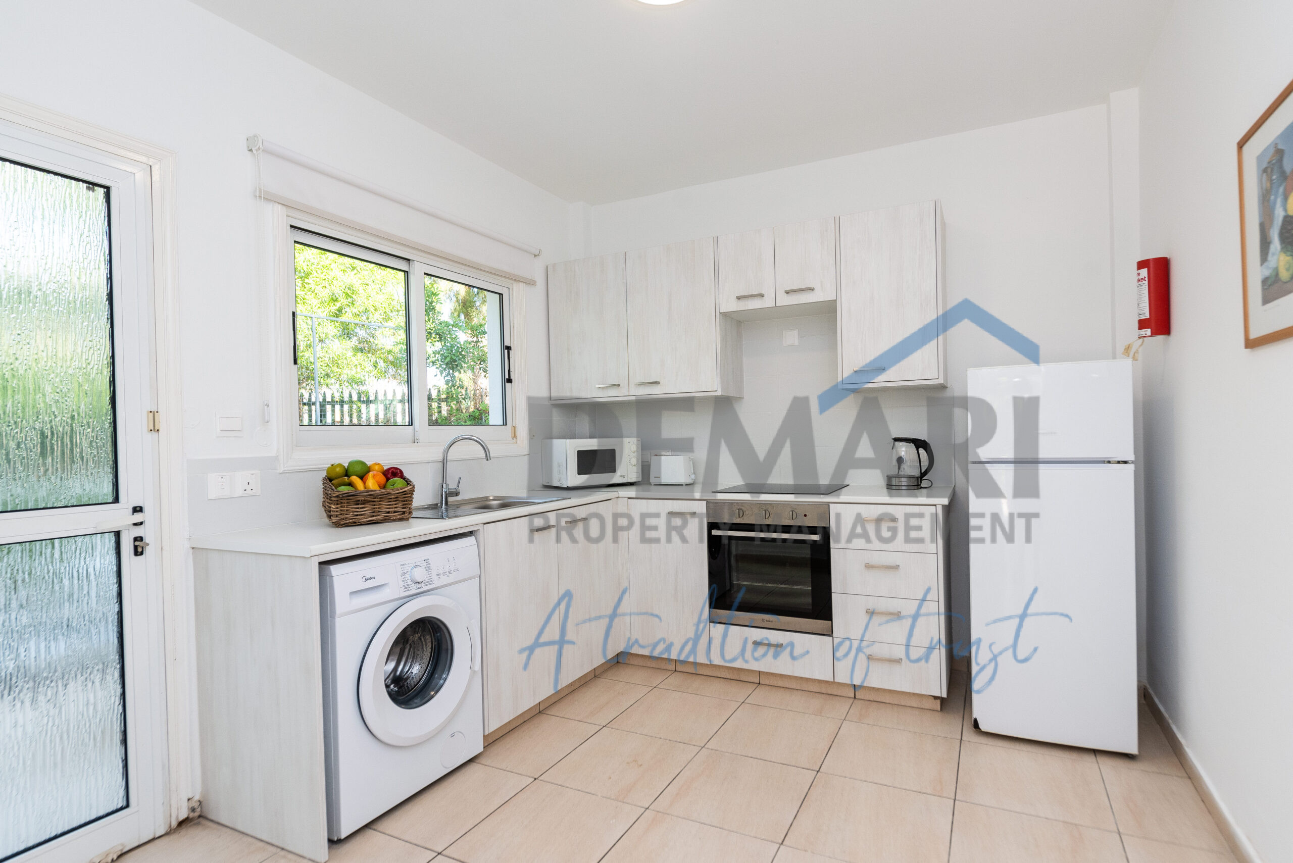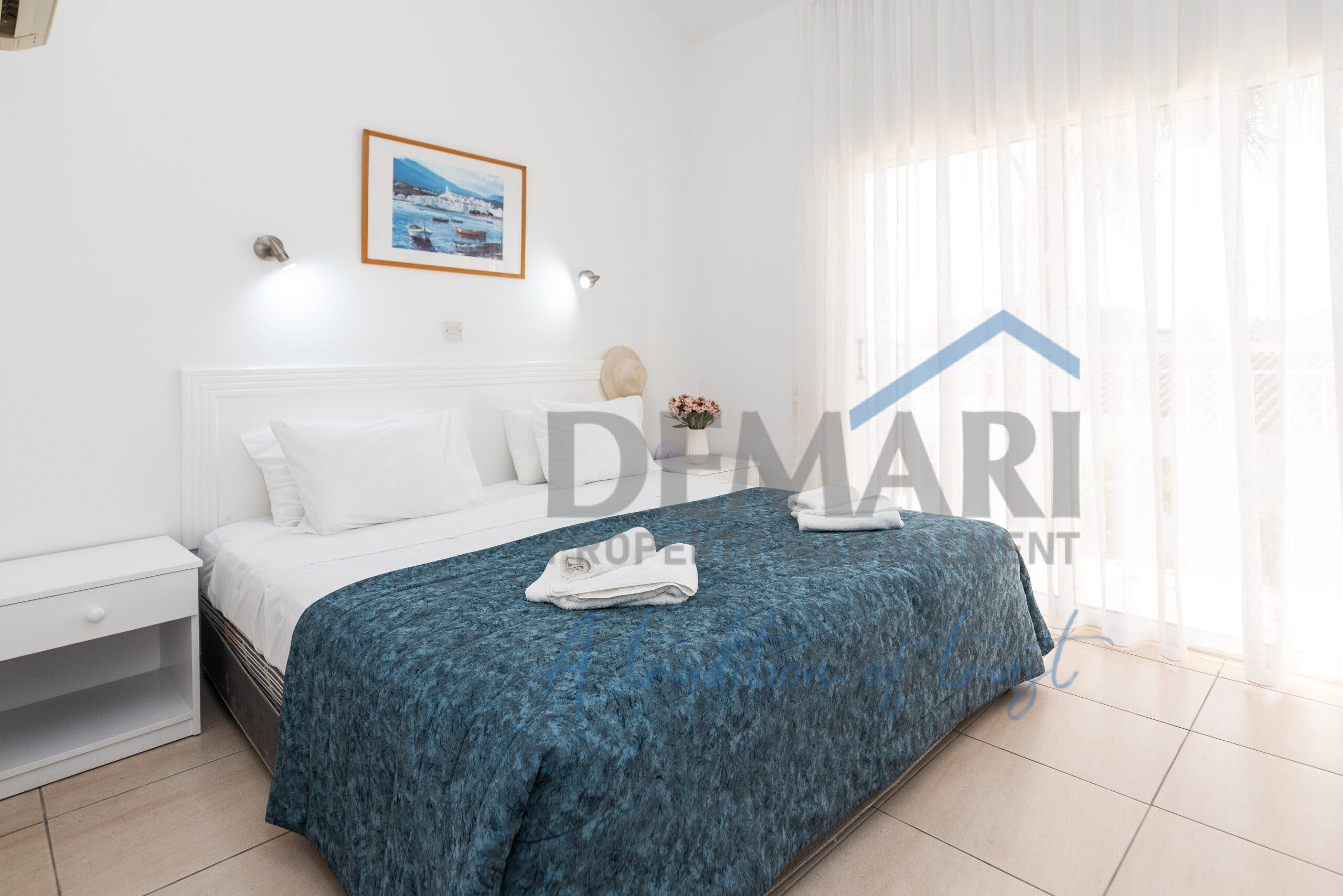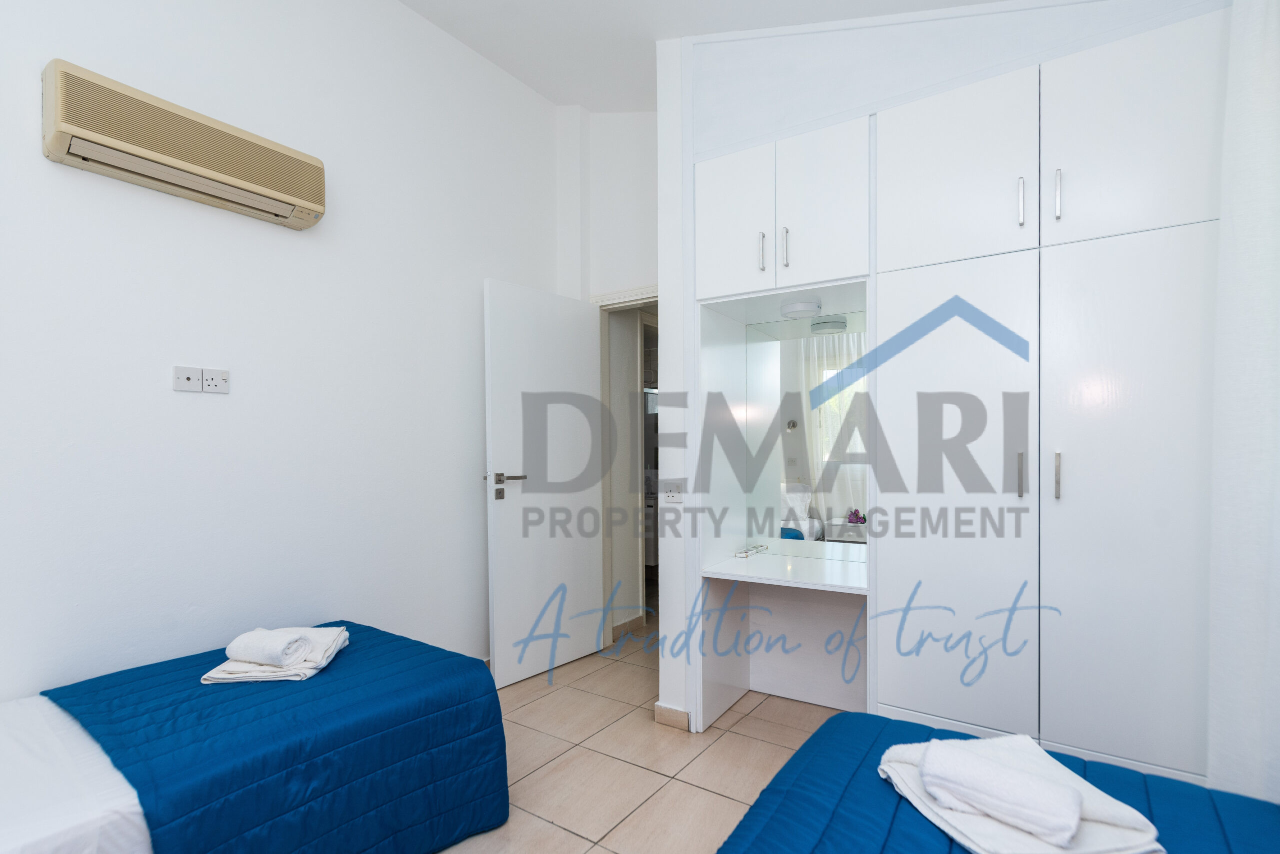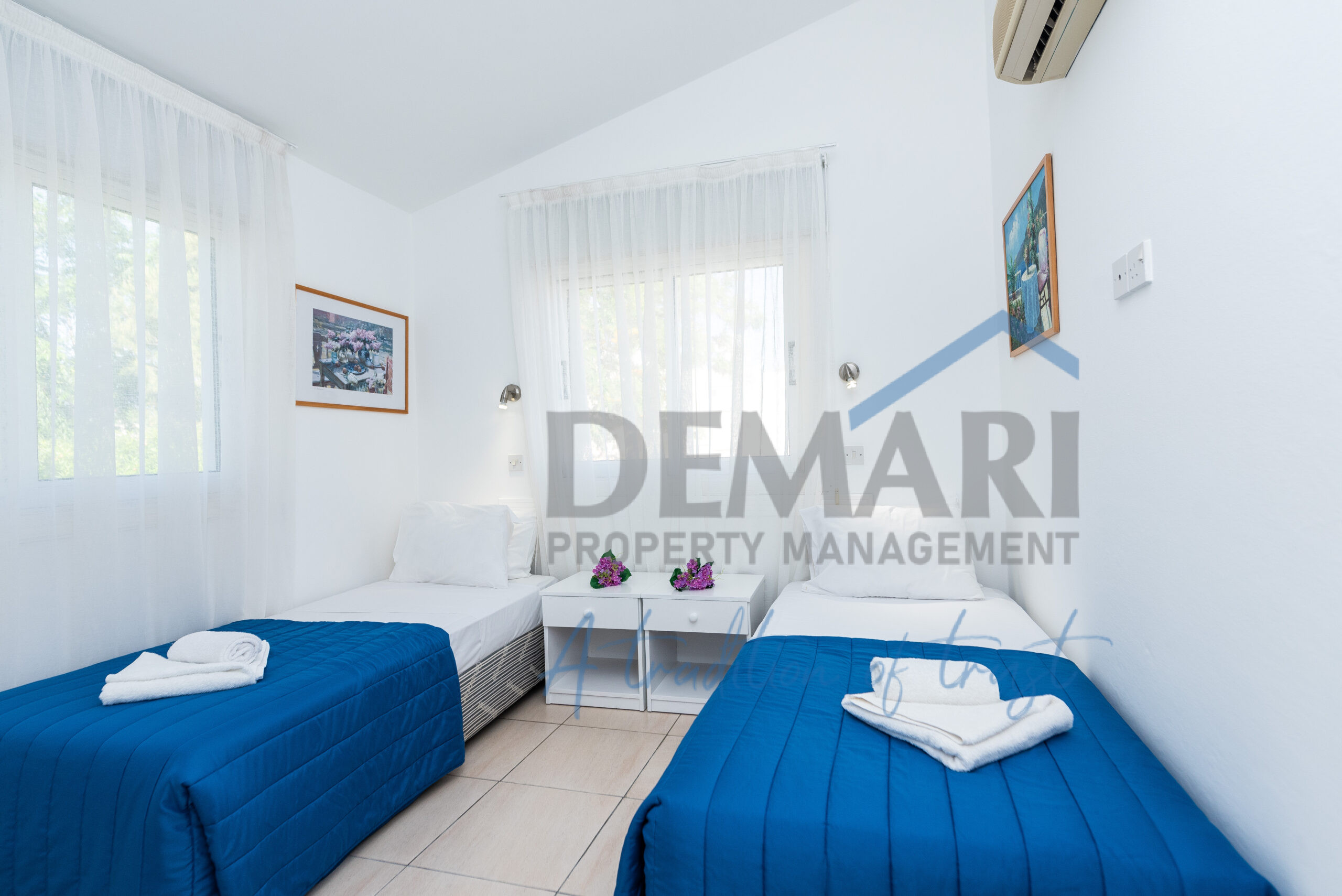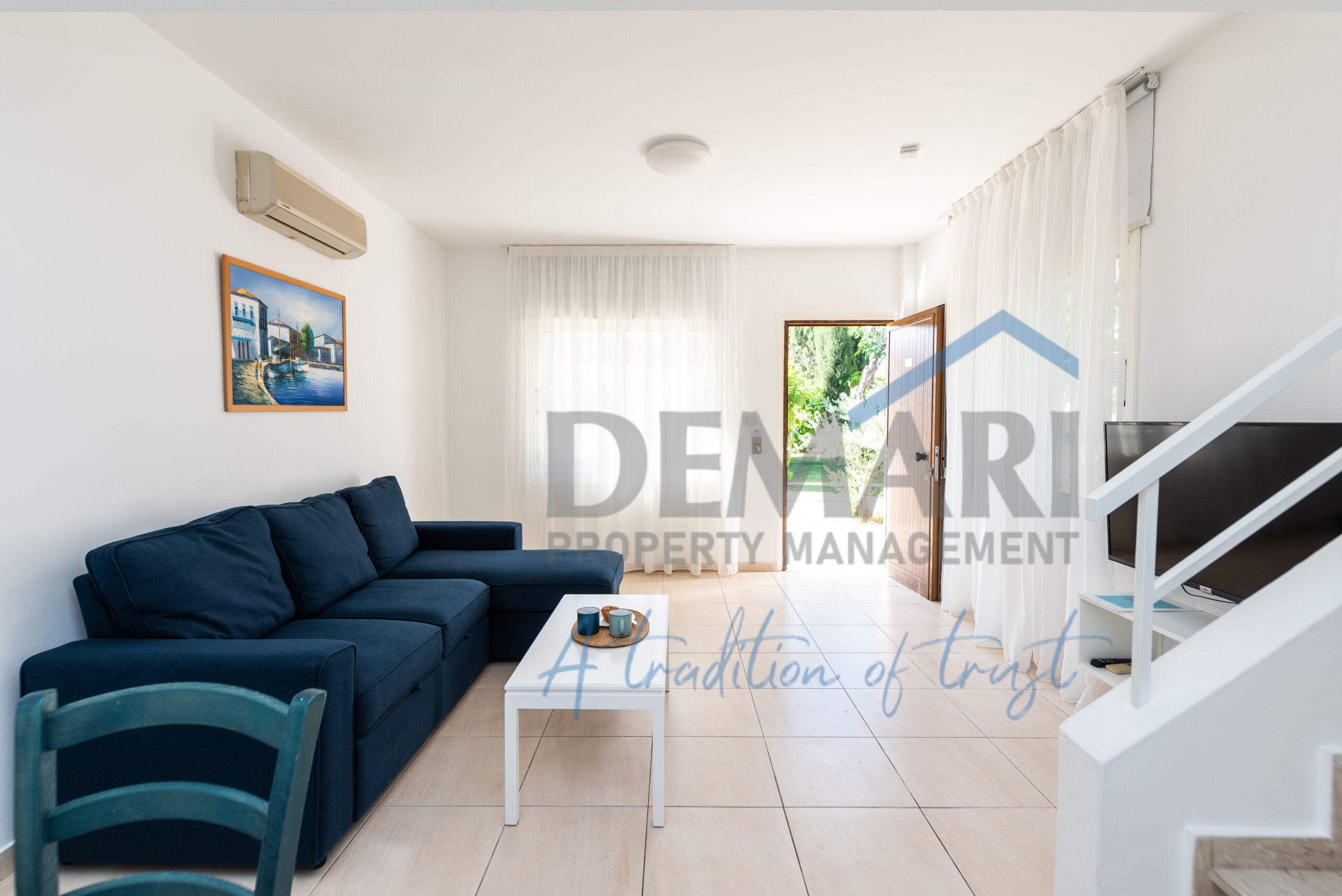 This simple but elegant two-bed townhouse features an open plan living and dining area and a fully equipped kitchen. All bedrooms share a family bathroom and a guest toilet. Bedrooms consist of built-in wardrobes and bed side tables. All rooms are fitted with air condition units offering all year round comfort. The small patio has garden furniture and offers a great view of the gardens for relaxing moments with friends and family.