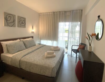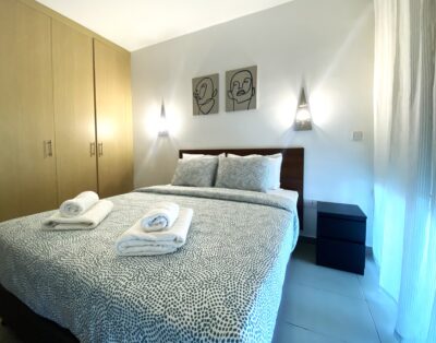 Retreat to the tranquil double bedroom, where plush linens cradle you in blissful comfort, ensuring a restorative night’s sleep. The black -out blinds together with the air condition will make your sleep last longer, bidding you to embark on another day of seaside splendor.