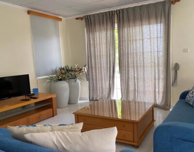 This beautiful villa features an open plan ground floor consisting of living room, dining room and kitchen with all necessary kitchen wares. The dining area consists of a dining table with sitting for 6 persons and the living area has been tastefully furnished with comfortable sofas as well as a coffee table and a Flat Screen TV.